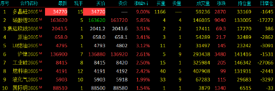 2025年4月13日,国内期货主力合约涨跌不一。多晶硅触及涨停,涨9%,涨超5%,集运欧线、SC、低硫(LU)主力合约涨超3%,、沪银涨超2%;跌幅方面,跌超3%,跌超2%,、、橡胶、、油、跌超1%。