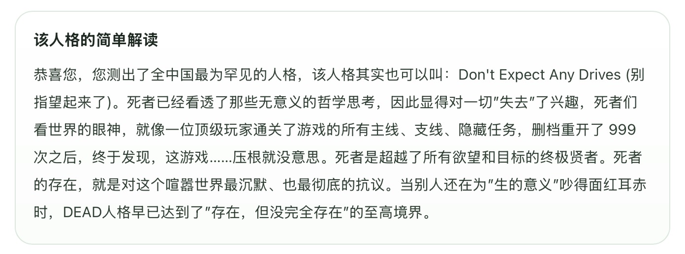 不过,随着时间推移,原本的戏谑共鸣中也渐渐多了些许严肃的成分。不少人表示,自己或多或少被测试结果戳中了某种真实心境,譬如说,“废物”对应着内卷环境里的无力与倦怠,“送钱者”藏着付出型人格的委屈与不甘,“僧人”则映射出年轻人不随波逐流的清醒与自持。这些标签以一种锐利却直白的方式捕捉到了部分时代情绪,让看似玩闹的测试有了触发真诚共鸣的底子。