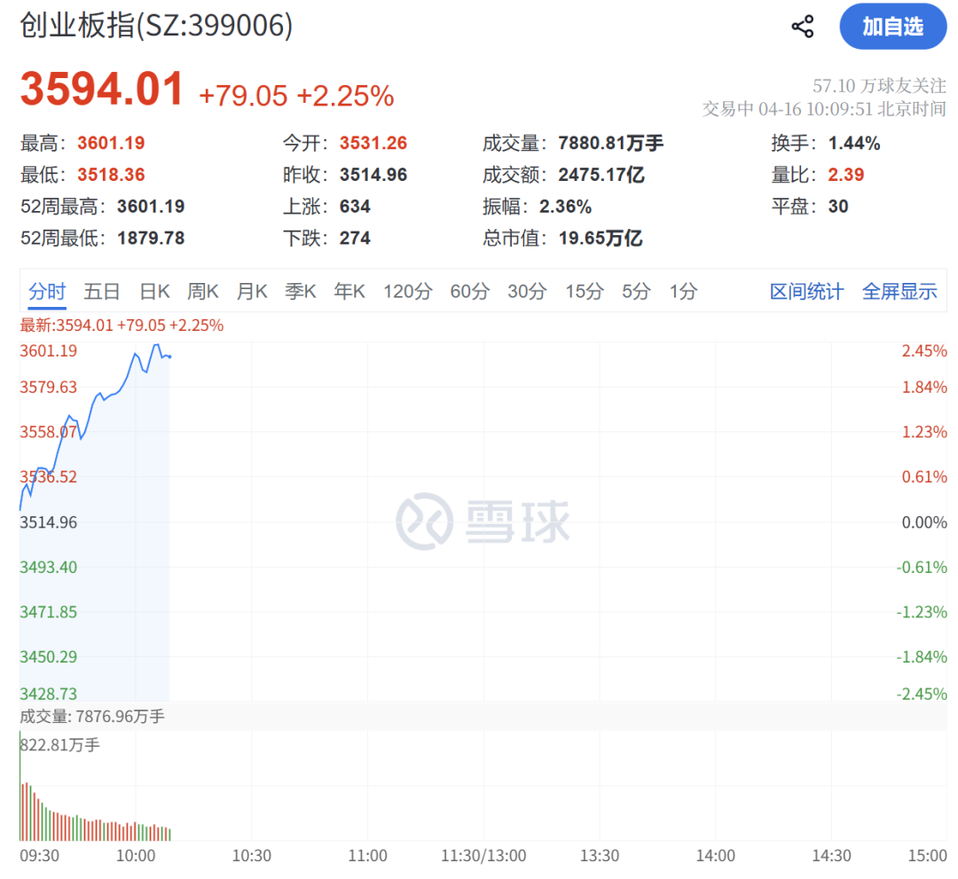 4月16日,A股主要股指开盘飘红,上证指数微涨0.07%,创业板指涨0.46%。随后,市场震荡上行,创业板指强势拉升,涨超2%。