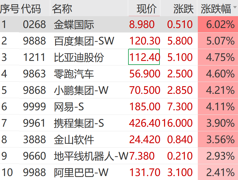 港股同步走强,恒生科技指数大涨超2%,金蝶国际、百度集团、股份等领涨恒生科技指数成份股。