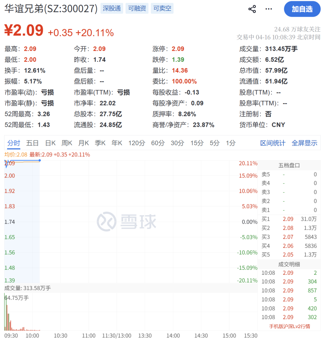 4月16日,华谊兄弟竞价涨停,报2.09元/股;开盘后短暂开板,但迅速回封涨停。截至发稿,买一达31万手。