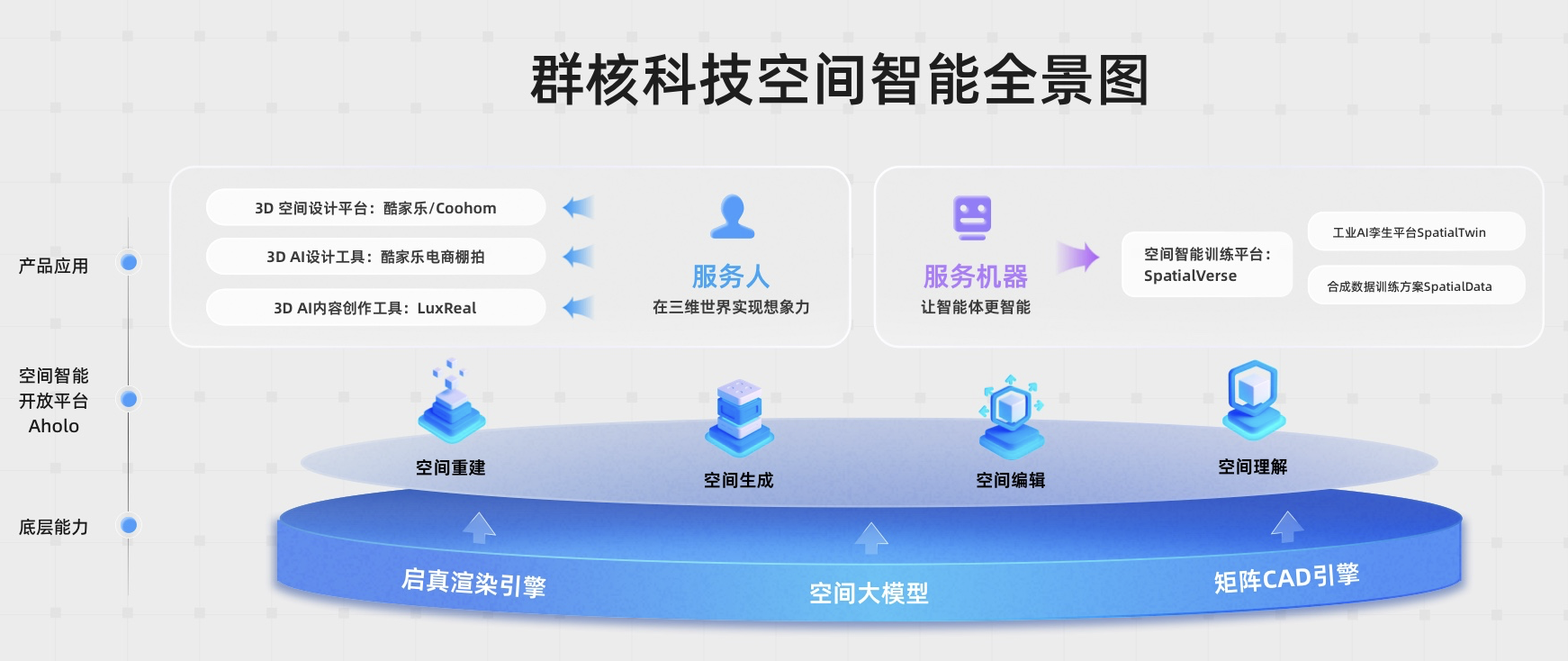 虽然业务几经切换,实际上技术底座是一致的,也为空间智能铺好了地基。目前群核科技的布局分为三层:底层是自建的GPU集群和算力基础设施,中间是空间语言模型SpatialLM、空间生成模型SpatialGen等技术引擎,上层则是面向不同场景的产品矩阵:可以是家装的酷家乐、也可以是工业的SpatialVerse空间智能平台,还可以是Aholo开放平台和LuxReal视频生成模型,这些都是群核科技想要讲述的新故事。