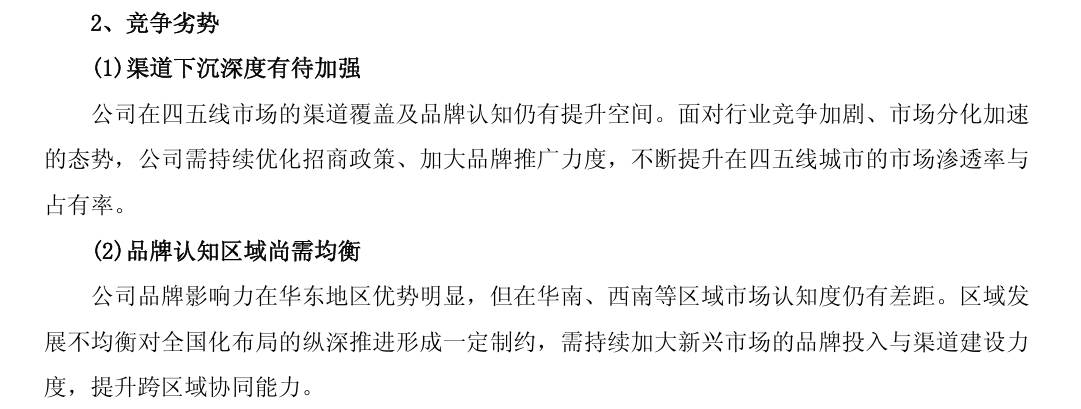 但实际上公司在年报中披露,“公司在四五线市场的渠道覆盖及品牌认知仍有提升空间”“在华南、西南等区域市场认知度仍有差距”。