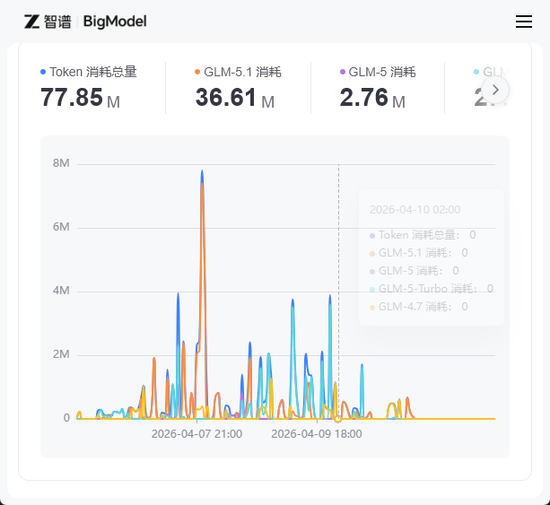 王先生提供的截图显示,截至4月12日,其套餐Token消耗总量为77.85M,最高的一天是4月7日,消耗Token还不到8M。对于限流原因,王先生认为是“超售”,也就是出售的算力超过了平台能承受的范围。