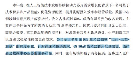 在人工智能技术发展持续拉动光芯片需求增长的背景下,公司数据中心领域销售额实现大幅度增长,收入占比超过50%,成为公司重要的收入来源。主要产品是硅光方案所需的大功率CW激光器芯片。