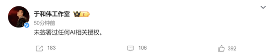 4月20日,张若昀工作室官方微博发文称:“没签过任何AI相关授权,法务正在紧急处理。”