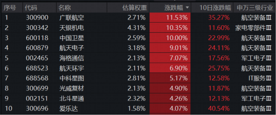 指数成份股方面,八成成份股飘红,航空、航天装备涨幅居前。、涨超10%,10%涨停封板,涨超9%,涨超7%。