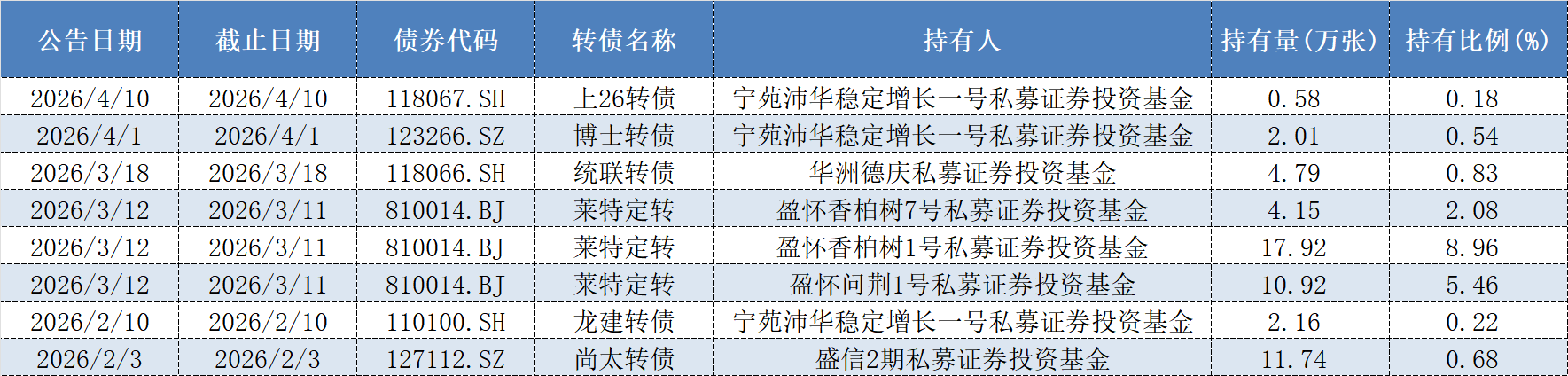 其中,盘京投资旗下的“盛信2期”持有11.74万张尚太转债(127112.SZ);宁苑资产旗下的“宁苑沛华稳定增长一号”持有2.16万张龙建转债(110100.SH)、2.01万张博士转债(123266.SZ)和0.58万张上26转债(118067.SH);湖南华洲投资私募旗下的“华洲德庆私募”持有4.79万张统联转债(118066.SH);南京盈怀私募旗下的“盈怀香柏树1号”、“盈怀问荆1号”和“盈怀香柏树7号”累计持有32.99万张莱特定转(810014.BJ)。