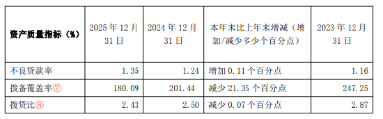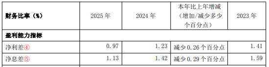 4月23日金融一线消息,发布2025年年度报告。截至 2025 年末,全行总资产 2903.43 亿元,较年初增加 203.99 亿元,增幅7.56%;各项存款余额 2245.00 亿元,较年初增加 145.35 亿元,增幅 6.92%;各项贷款余额1949.07 亿元,较年初增加 60.56 亿元,增幅 3.21%;营业收入 41.18 亿元,同比下降7.72%;净利润 12.44 亿元,同比下降23.35%;不良贷款率1.35%,较上年末增加 0.11 个百分点;拨备覆盖率 180.09%;净息差1.13%,较上年减少0.29个百分点。