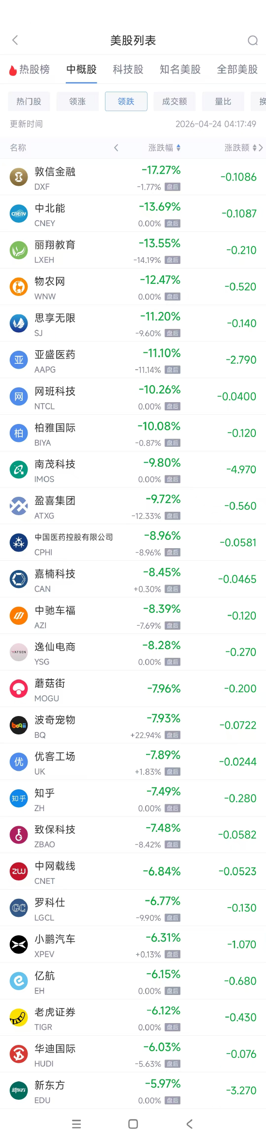 4月24日热门中概股普跌,中国金龙指数(HXC)收跌2.47%。