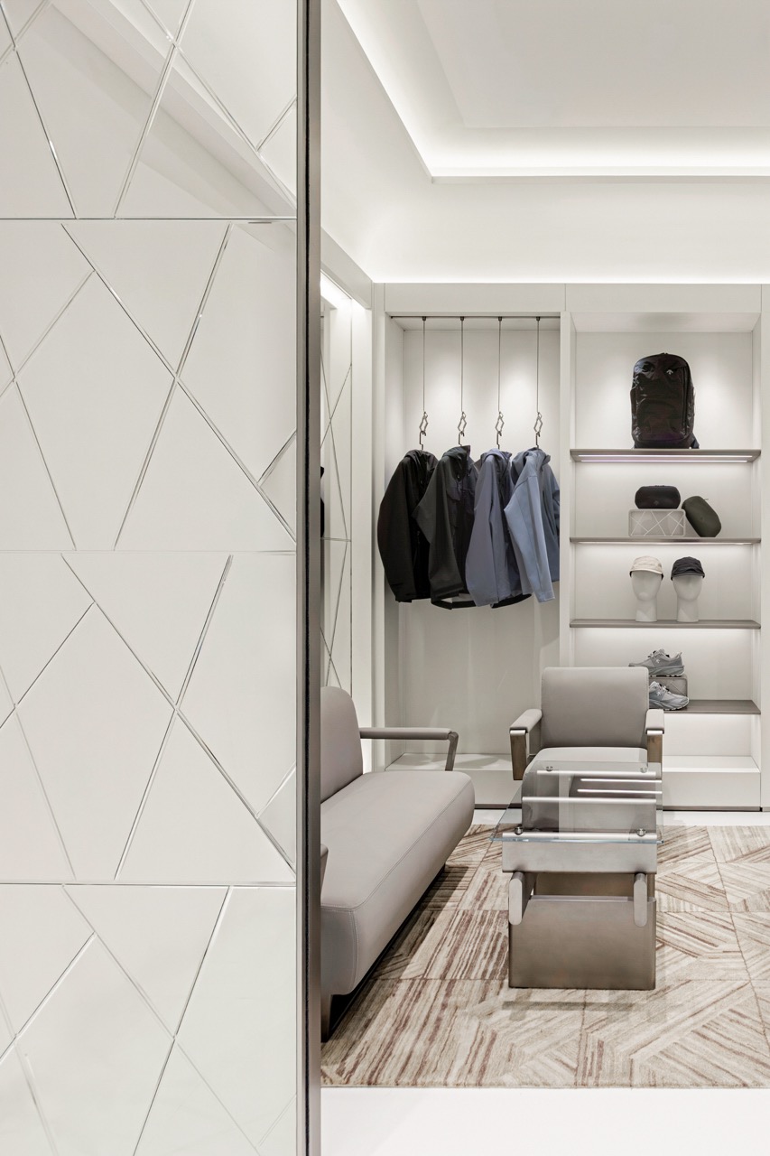 空间内部以不同产品线为线索进行分区呈现。“水释冰陆”区域对应ALLTERRAIN系列,以雨水低温凝结的自然形态为灵感,回应产品对复杂环境的适应能力;“裂冰之地”则聚焦DUALIS系列,通过更具线性的结构语言呼应城市通勤场景;高尔夫系列被置于流线型空间之中,以轨迹感强化运动本身的精准特征。与此同时,鞋墙借由冰晶结构灵感展开,通过秩序化排列强化整体视觉节奏。在高端零售场域中,迪桑特试图通过空间叙事与产品陈列的结合,让专业运动装备从功能展示转向更完整的生活方式表达,提升消费者对专业运动装备的理解与感知。