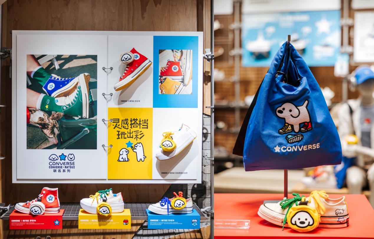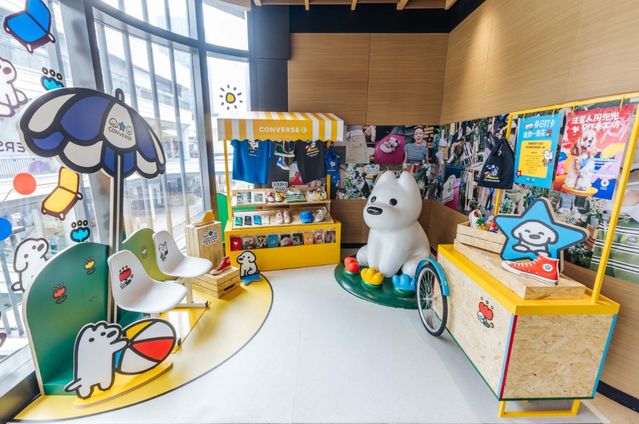 4月16日至5月17日,CONVERSE在上海前滩太古里打造CONVERSE X MATSUI限时空间,将联名系列中的插画语言延展为一个可进入的线下场景。围绕艺术家MATSUI松井一将标志性的萌宠形象与高饱和配色,空间被构建为一处具有童话感的“春日手账”,通过装置、陈列与互动路径的组合,让产品表达从视觉层面转向更具参与感的体验。