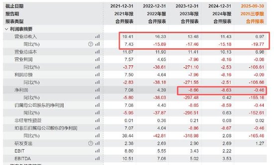 目前,公司营收大幅缩水,21年营收为19.41亿元,2025年前三季度仅为6.97亿元;已经连续三年持续亏损。