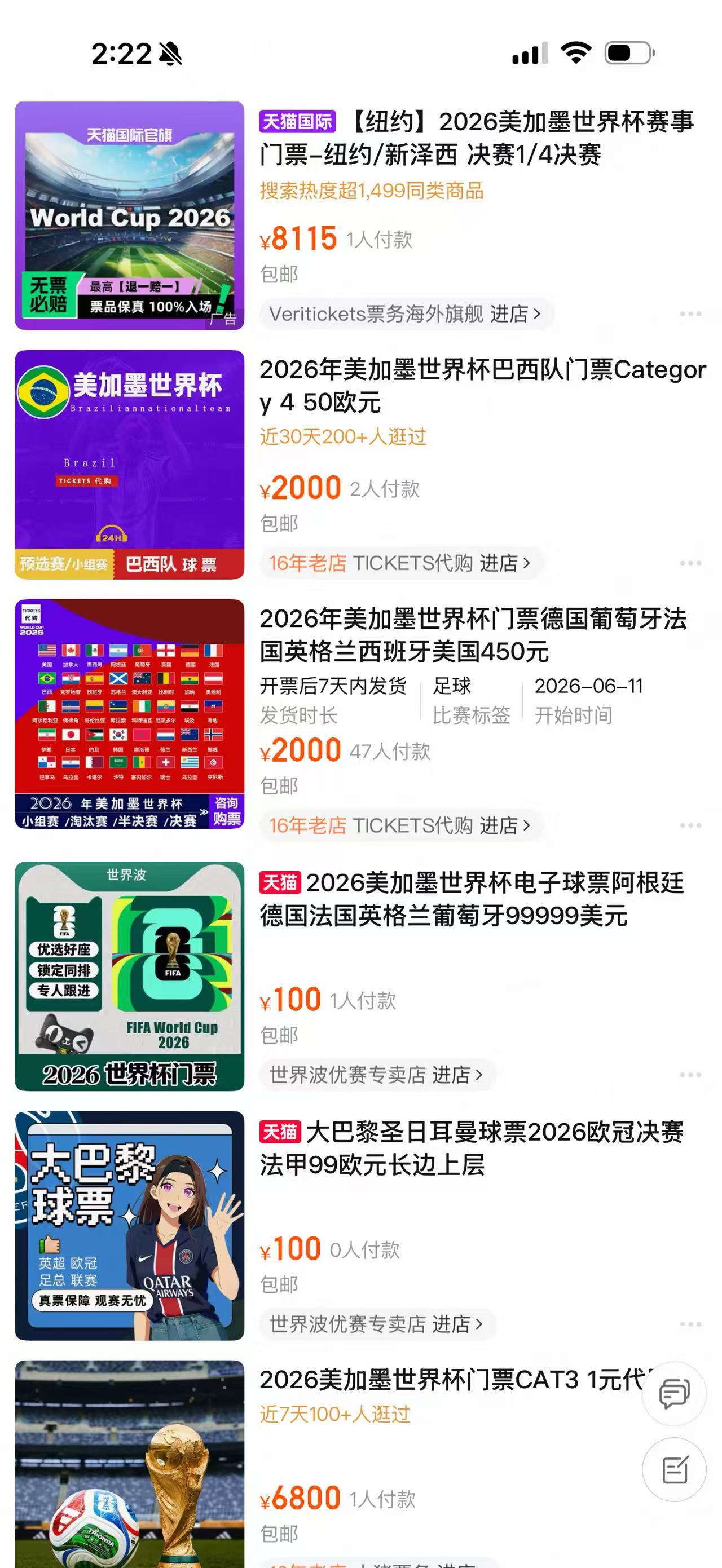 界面新闻查询淘宝、闲鱼等第三方平台发现,有不少门店售卖不同场次的门票。一家天猫国际上的票务公司推出在纽约/新泽西的1/4决赛门票,售价8115元起,该店铺客服告诉界面新闻记者,“我们售卖的票品保证真实有效,100%可以入场。”界面新闻查阅发票,目前该店铺的大部分门票都已售罄,6月22日晚上20:00挪威VS塞内加尔CAT3的门票还可以购买,这一场比赛的票面票价为650美元。