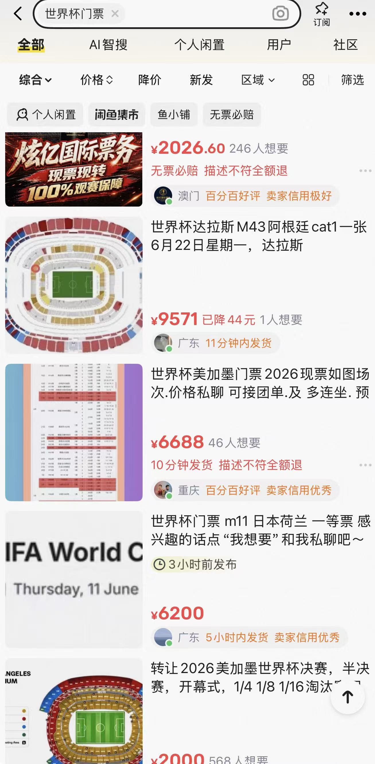 在闲鱼,界面新闻也检索到不少二手转售票。售价从1000元到9600元不等。界面新闻联系的一位卖家告诉记者,其手上有一张6月22日在美国达拉斯Match43阿根廷cat1票。“我是现票,官方系统可以马上转,你收到票才需要点确认收货。转票过程我会全程拍视频并和你double check。”该卖主告诉界面新闻。