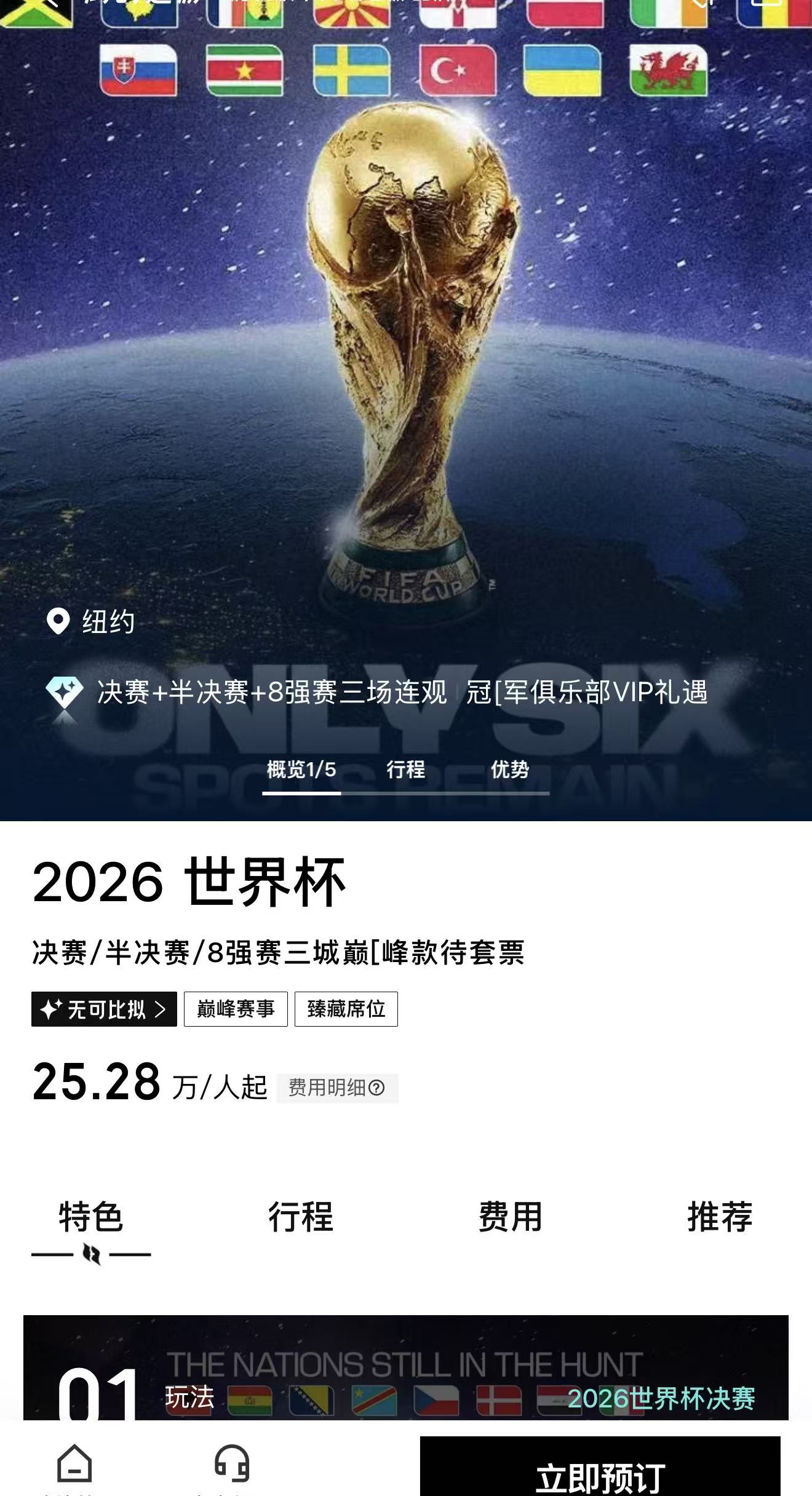 在第三方平台携程,一家做高端定制游的企业,推出2026世界杯决赛/半决赛/8强赛三城巅峰款待套票,售价252800元/人起。店铺管家告诉界面新闻记者,这套产品包含决赛+一场半决赛+一场8强赛在内的三张门票,“2026美加墨世界杯决赛FIFA Pavilion营帐款待票代订1张,2026美加墨世界杯达拉斯半决赛Champion club(冠军俱乐部)款待票代订1张,2026美加墨世界杯洛杉矶8强赛Champion club(冠军俱乐部)款待票代订1张。”管家对界面新闻表示,该行程从洛杉矶到达拉斯、纽约,共计10天。