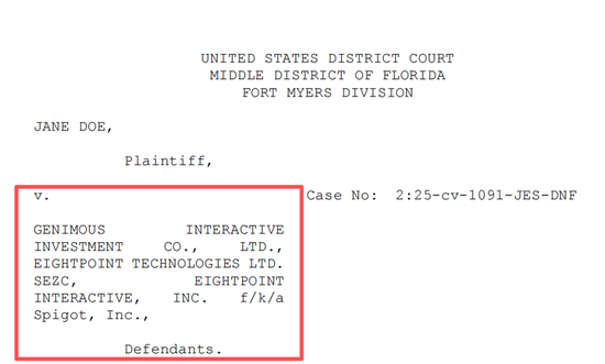 据美国佛罗里达州中区地方法院官网,一份签署日期为2026年2月的裁判文书显示,原告Jane Doe于2025年11月提起诉讼,起诉Genimous Interactive Investment Co., Ltd.(以下简称“Genimous Interactive”)、Eightpoint Technologies Ltd. SEZC(以下简称“Eightpoint”)以及 Eightpoint Interactive, Inc.(原名 Spigot, Inc.,以下简称“Spigot”),并就2023年12月9日在佛罗里达州迈尔斯堡发生的一起性侵(sexual battery)事件提出过失及替代责任主张。