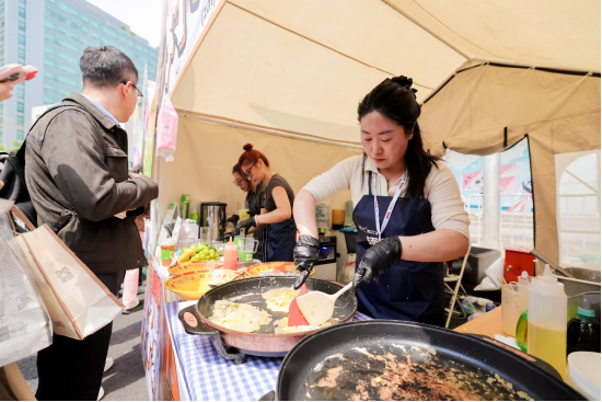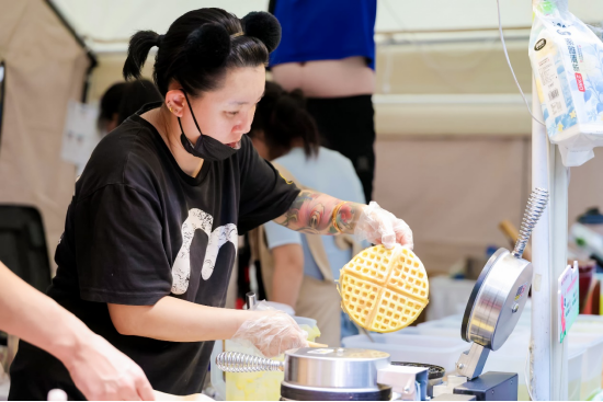 活动现场,美食摊位人流最密集,纽约贝果博物馆、Blue·G Bakery等全网爆火的网红店,与东来顺、德南面包房等老字号同台营业,琳琅满目的各式各样美食中,满是观众大快朵颐的欢笑声。