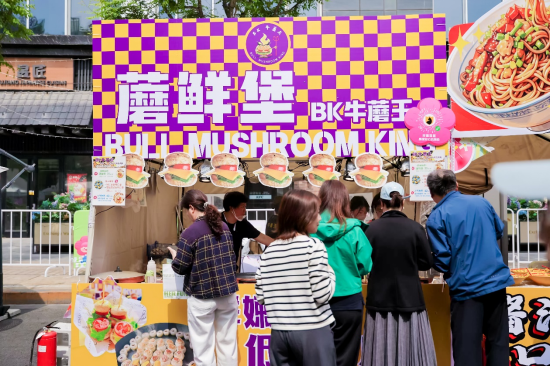德南面包房、BK牛蘑王、东来顺、沐家苹果派、悦己巷子烤鸭卷等摊位门前大排长龙。