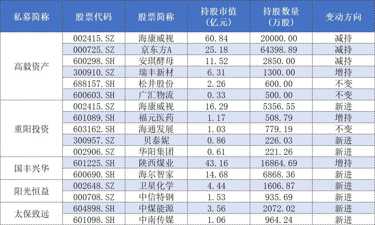 两大老牌百亿私募高毅资产和重阳投资罕见“同框”海康威视(002415.SZ)。