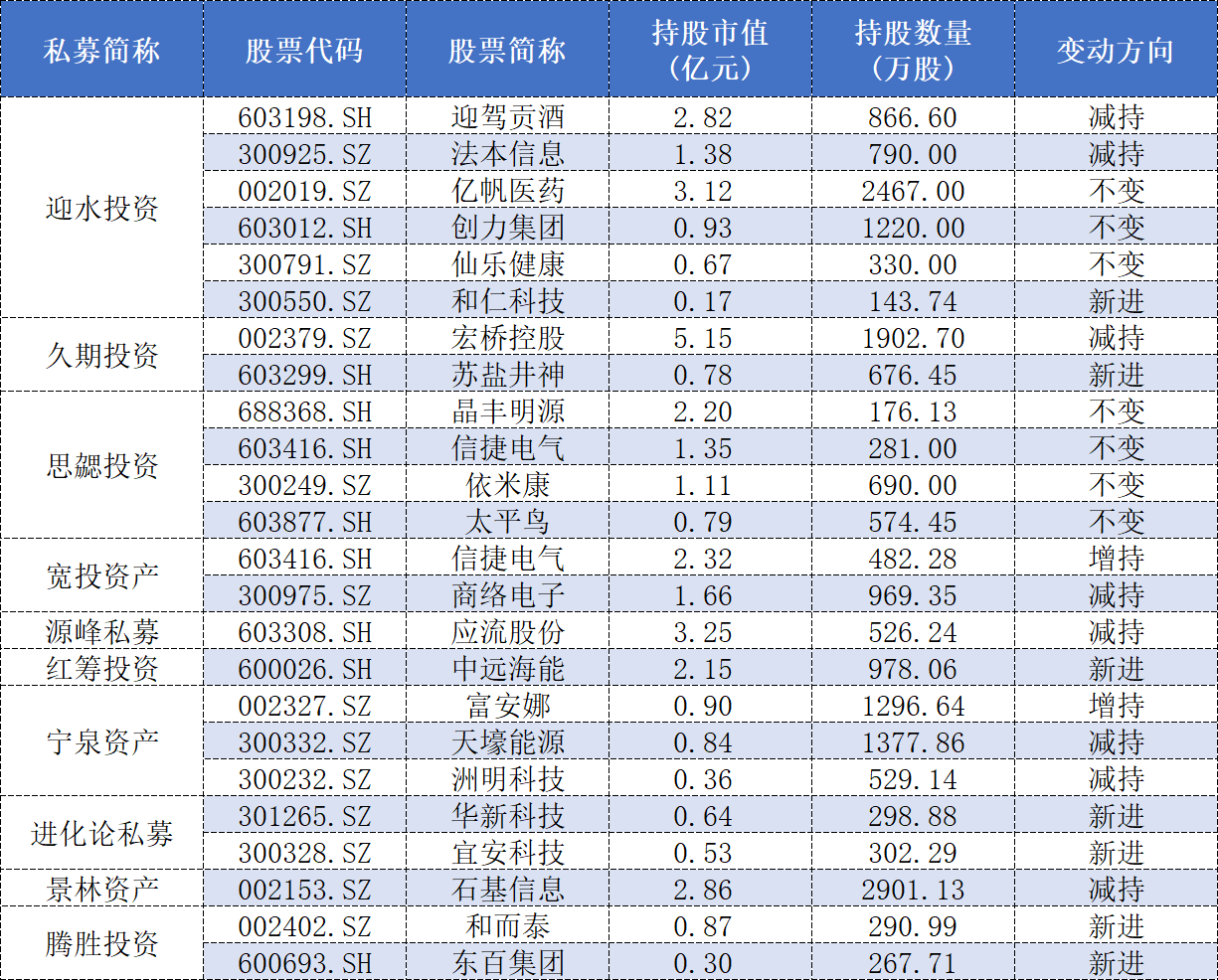 阳光恒益新进成为卫星化学(002648.SZ)和中信特钢(000708.SZ)前十大流通股东之一,期末持仓参考市值分别为4.44亿元和1.53亿元。