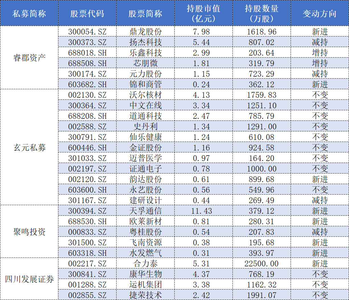 睿郡资产旗下两只产品同时新进鼎龙股份(300054.SZ)一季报前十大流通股东,期末持仓参考市值合计达7.98亿元。同时睿郡资产一季度减持扬杰科技(300373.SZ)和元力股份(300174.SZ),增持芯朋微(688508.SH)和乐鑫科技(688018.SH),新进锦和商管(603682.SH)。