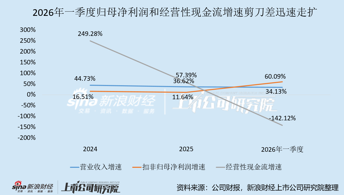 据公司2026年一季度报告,公司单季度营收、扣非归母净利润分别同比大涨34.13%、60.09%,经营活动现金流却再度转负,为-1.59亿元,利润与现金流表现再度背道而驰,增速剪刀差迅速走扩。